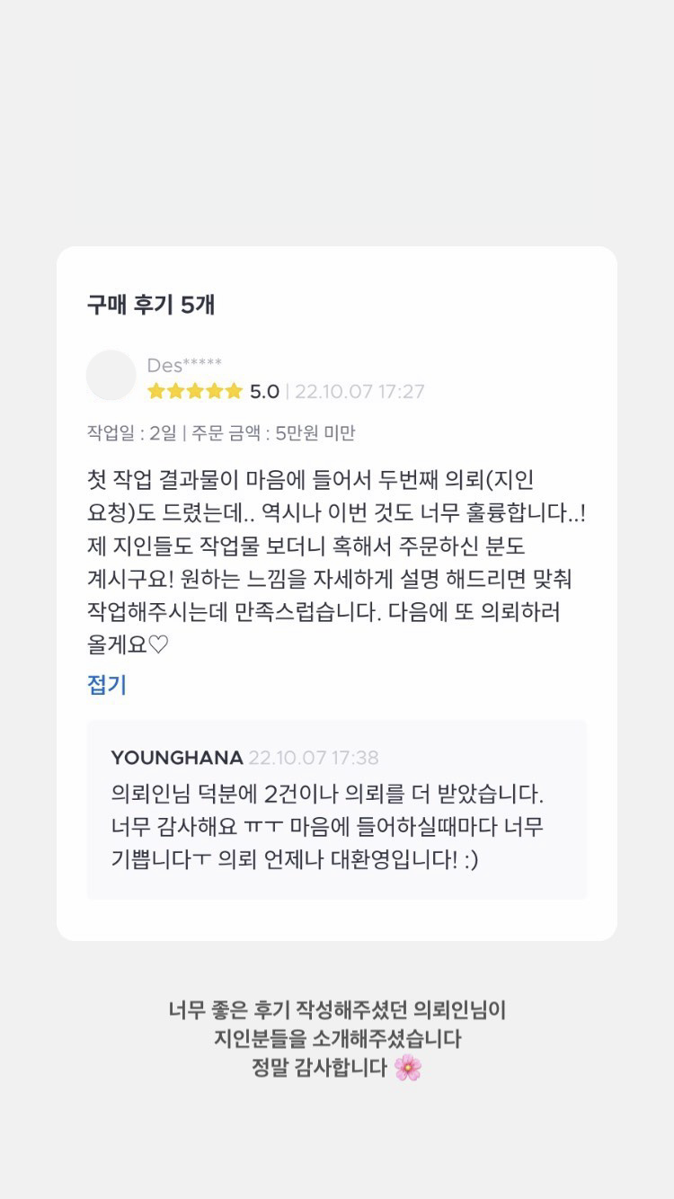 의뢰해주셨던 모든 분들께 정말 감사드립니다! 후기들은 저의 소중한 보물입니다 ♥︎