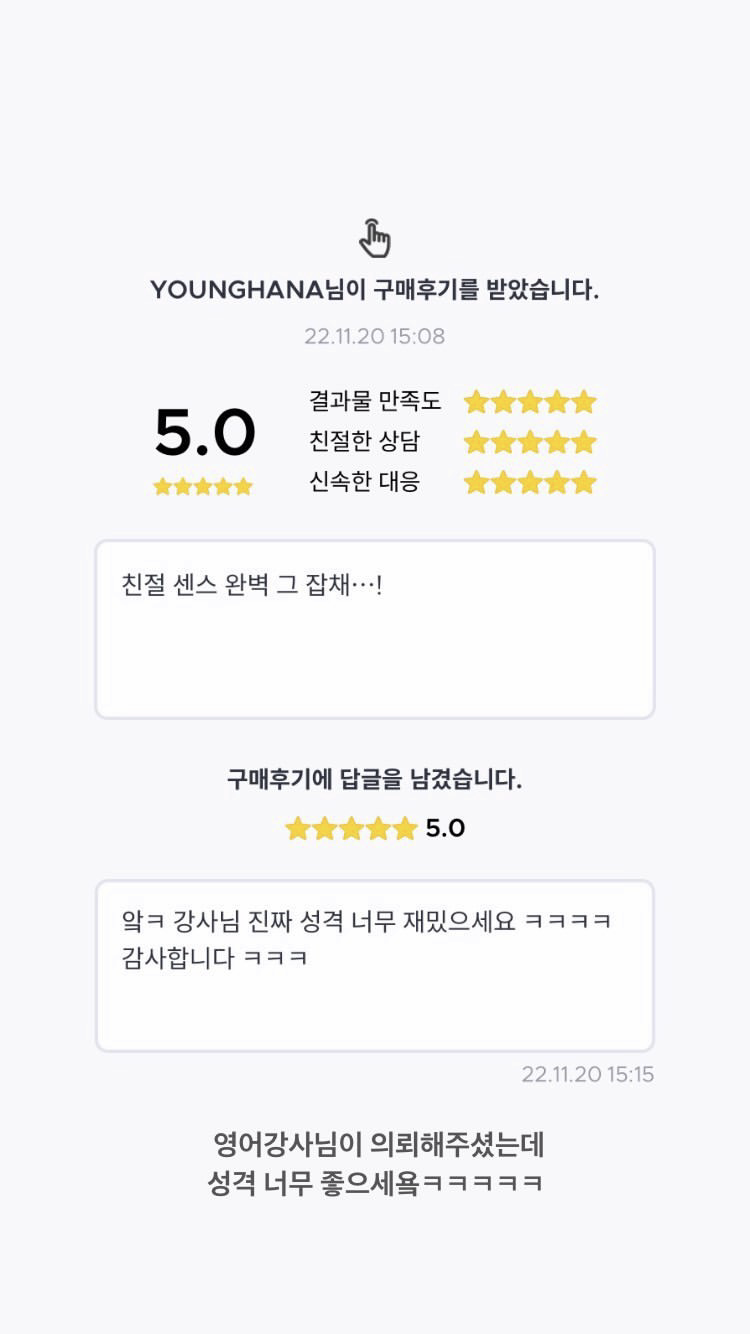후기들은 크몽에서도 확인하실 수 있습니다. https://kmong.com/@YOUNGHANA